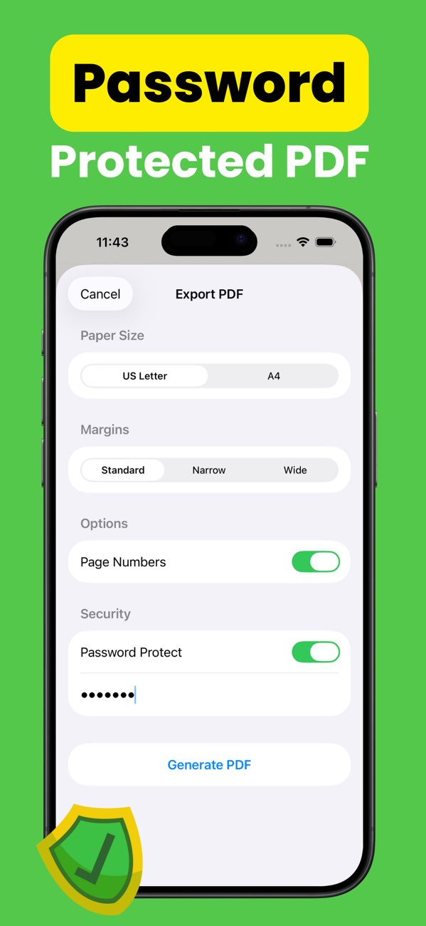 toPDF is a text to PDF app for iPhone and iPad. Start from templates, format your content, choose export settings, and generate polished PDFs offline with optional password protection.